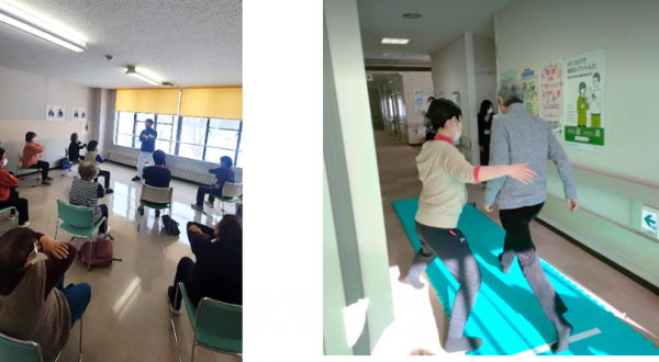 測定会後には、「認知症予防椅子空手」の実演を行いました。このプログラムは、空手の形を行いながら気合とともに呼吸法やストレッチを行い、初心者や脳トレが苦手な方でも楽しみながら参加できる内容となっており、当社の動画配信サービス「健幸TV」でも人気のプログラムとなります。