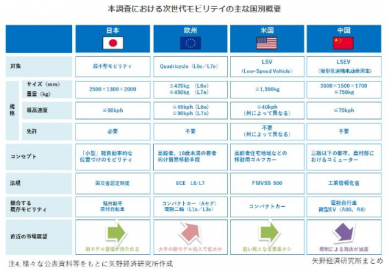 日本では、約10年の歳月をかけて規格が創設された「超小型モビリティ」であるが、型式指定を唯一取得していたトヨタ自動車の「C+pod」が2024年夏頃で生産を終了することがすでに一般告知され、市場は立ち上がって4年半で早くも先行きが見通せなくなった。欧州のQuadricycle(クワドリシクル:Lカテゴリー四輪車)はこれまで欧州新車市場においてニッチ市場であったが、Citroën(シトロエン)の「Ami」が発売から約3年半で累計販売台数が欧州全体のQuadricycle年間販売台数に匹敵するなど過去に例をみないほど同市場は活況を呈している。反対に、中国のLSEV(Low Speed Electric Vehicle)は最盛期からは後退し、交通事故が多発したことで安全基準に関する厳格な技術要件と参入企業の制限が敷かれ、上汽通用五菱汽車(シャンチートンヨンウーリン)の「宏光MINI」に代表される微型EV(A00セグメント)が台頭し、LSEV市場は大幅に縮小している。