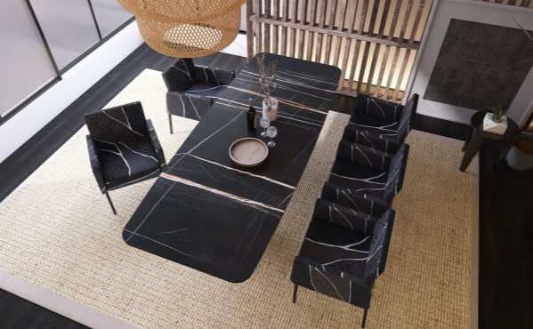 ダイニングテーブルには、イタリアの最高級セラミックを使用しています。日本の高い技術により磨きあげられ、その質感と美しさがより引き立てられた商品です。また、ダイニングチェアの張地には京都の西陣織を採用。伝統技術とモダンデザインの融合により、アートのような存在感がありながら、日常生活に溶け込むチェアに仕上げています。