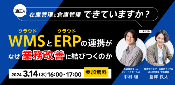 eコマースの自動化型DXサービスを提供する株式会社コマースロボティクス(本社:東京都港区、代表取締役:伊藤彰弘)は、2024年3月21日(木)16:00よりクラウドERP「キャムマックス」を提供する株式会社キャム(本社:福岡県福岡市、 代表取締役:下川良彦)と共催で無料ウェビナー『適正な在庫管理と倉庫管理、できていますか?WMSとERPの連携がなぜ業務改善に結びつくのか』を開催いたします。