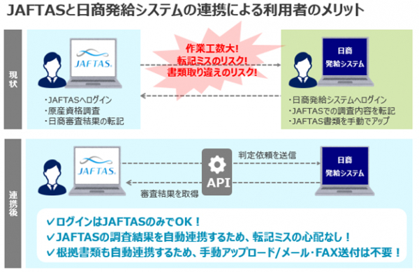 現状、JAFTAS利用企業はJAFTASでEPAに基づく原産品であることを証明した後に、発給システムにログインし、JAFTASで行ったEPAに基づく原産品であることの調査内容や手続きに必要な関係書類を発給システムに入力・アップロードしたり、日商から判定審査結果を入手した後はJAFTASに登録して輸出者へ回答したりしています。両システムの接続により、JAFTASへのログインだけで、JAFTASで使用したデータや書類の日商発給システムへの送付、日本商工会議所からの判定審査結果受領が可能になります。再入力する際の転記ミスや、書類の手動アップロード/メール・FAX等が不要となることで、原産性調査のための作業全体の約3割が削減できる見込みであり、作業効率の大幅な向上を実現します。
