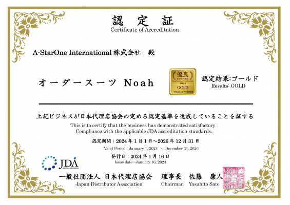 業界開業数No.1オーダースーツNoahを運営する A-StarOne International株式会社(東京都港区 代表:坂本大地 )は、代理店ビジネスの普及促進を図る一般社団法人日本代理店協会(JDA)による優良ビジネス認定2024(Good Business Certification)において、「オーダースーツNoah」が最高ランクであるゴールド認定を取得いたしましたことをお知らせします。