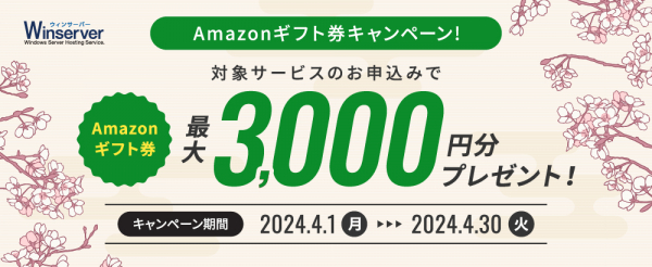Winserver(ウィンサーバー/運営会社:アシストアップ株式会社、所在地:大阪府大阪市、代表取締役:青木 勝彦)は、2024年4月1日(月)〜4月30日(火)の期間、Amazonギフト券キャンペーンを実施いたします。