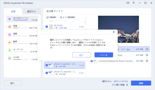ステップ2:ファイル名、撮影日時、ファイルサイズなどを比較しながら、重複している写真を選択する