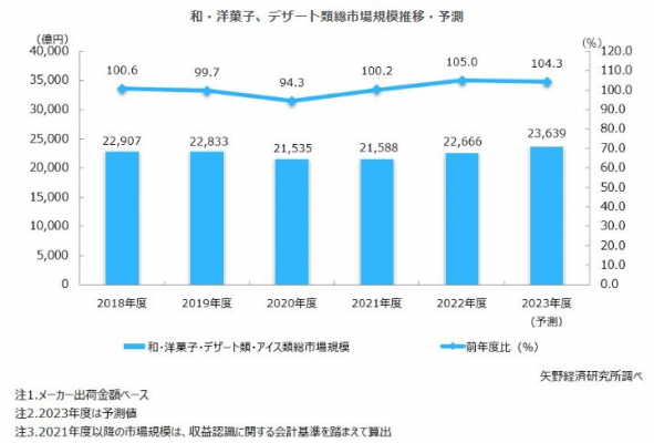 2023 年度の和・洋菓子、デザート類総市場規模(メーカー出荷金額ベース)は、前年度比4.3%増の2兆3,639億円を予測する。