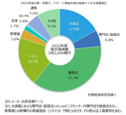 2022年度の和・洋菓子、デザート類総市場における流通チャネル別構成比は、百貨店が17.0%、専門店・路面店(ショッピングセンター内専門店含む)が6.4%、量販店が37.3%、CVS(コンビニエンスストア)が19.1%、駅関連が3.6%、空港が1.7%、SA・PA(サービスエリア・パーキングエリア)が0.8%、通販が5.0%、その他(法人需要等を含む)が9.1%となった。