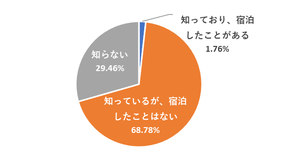 生後のお子さま(末子)をもつ女性(n=740)に、産後ケアホテルを知っているか、宿泊利用したことがあるかを聞いたところ、「知っており、宿泊したことがある」が1.76%、「知っているが、宿泊したことはない」が68.78%、「知らない」が29.46%となった。利用率はわずか2%弱であった。