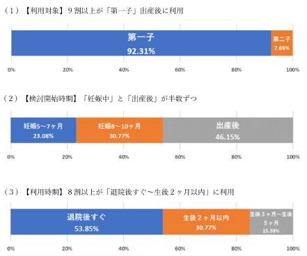 ・利用者「第一子出産時。半数以上が妊娠中に検討を開始し、生後2ヶ月以内に利用」