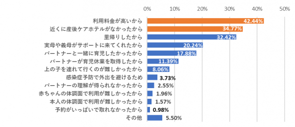 一方で、「知っているが、利用したことはない(n=509)」と回答した被験者に「産後ケアホテル」を利用しなかった理由を聞いたところ、「利用料金が高いから(42.44%)」が理由として最上位にあげられた(図4)。