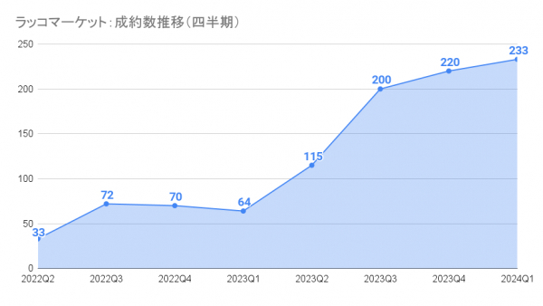 四半期ごとの成約数推移を見ても、2023年の後半からプラットフォームの規模が急激に拡大していることがわかります。