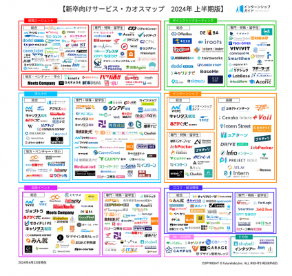 インターンシップ総合ナビサイト「インターンシップガイド」(https://internshipguide.jp/ )を運営する株式会社futurelaboは2024年4月23日、新卒採用関連のサービスをまとめた「新卒向けサービス・カオスマップ 2024年 上半期版」を公開しました。