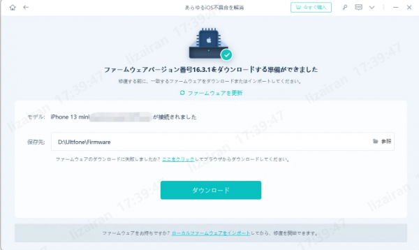 step2:接続したiPhoneに適したファームウェアパッケージが検出され、ダウンロードできるようになります。一連の修復処理を開始する前に、正しいパッケージをダウンロードして下さい