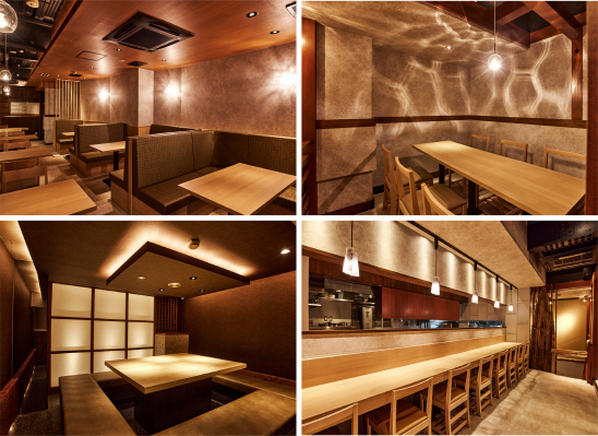 まるで木漏れ日が差し込むような、落ち着いた雰囲気の中で、美味しいお料理とお酒を楽しむことができます。特別なイベントや祝い事の宴会にも使いやすい空間です。