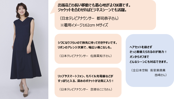 しわになりにくく、持ち運びに便利で、一枚で華やかに見えるワンピースは、落ち着いたネイビーカラーの柔らかな素材を採用し、場所や年齢・体型を選ばず、様々なシーンで活躍します。着回しがきくデザインで、リボンの結び方を変えることで違った雰囲気が楽しめます。ウエスト周りの調整が可能なため、移動時は締め付けず快適に過ごせるなど、移動が多いCAとアナウンサーならではのアイデアが詰まった一着です。