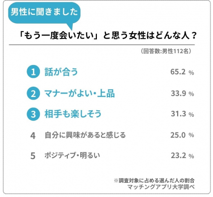 では、逆に「もう一度会いたい」と思われる女性にはどのような特徴があるのでしょうか。性格や行動などについて聞いてみました。