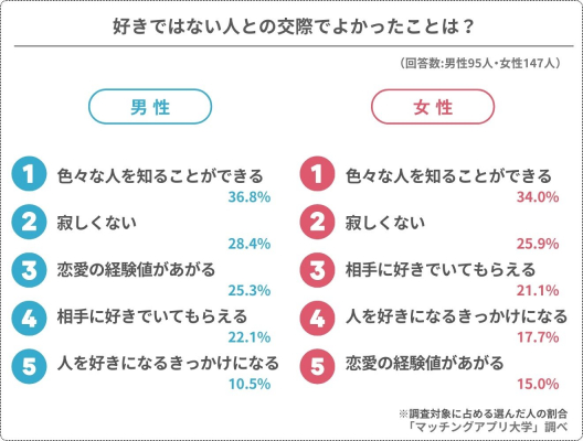 男女ともに「いい人だとは思ったが、異性としては好きにはなれなかった」と回答した人が多数派となりました。