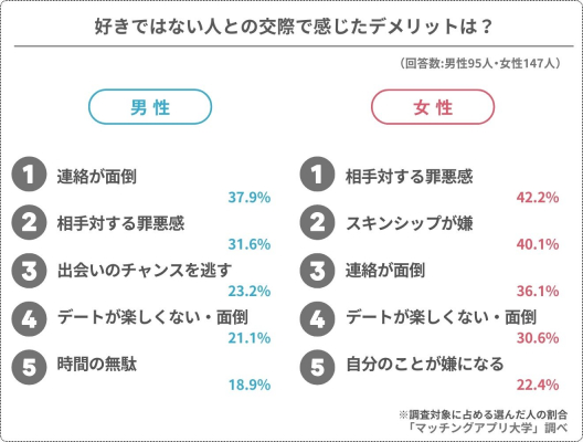 好きでもない人との交際のデメリットとして、男性がワースト1に選んだのは「連絡が面倒」でした。女性も3位にランクインしています。