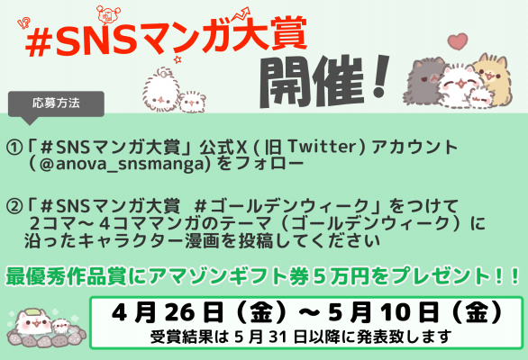エイノバ株式会社(本社:東京都千代田区、代表取締役社長:安倍義人)がキャラクターマンガ投稿の活性化及び、更なる可能性を秘めたキャラクターコンテンツを応援するためX(旧Twitter)で「ゴールデンウィーク」をテーマに、キャラクターマンガの応募を募る第4回『SNSマンガ大賞』を2024年4月26日より開催致します。