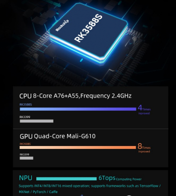RK3588S は、8nm リソグラフィープロセスを備えた Rockchip の新世代フラッグシップ AIoT SoC です。 8コア64ビットCPUを搭載し、最大2.4GHzの周波数を実現します。 ARM Mali-G610 MP4 クアッドコア GPU および内蔵 AI アクセラレータ NPU と統合されており、6Tops のコンピューティング能力を提供し、主流の深層学習フレームワークをサポートします。強力な RK3588S は、さまざまな AI アプリケーション シナリオでより最適化されたパフォーマンスを提供できます。