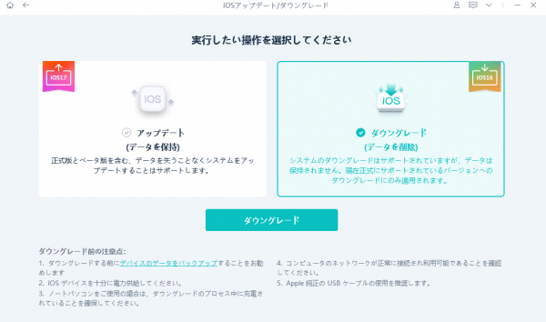対処1、ワンクリックでiOS17.4からダウングレードする