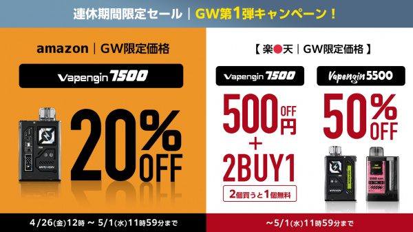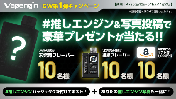 株式会社ドローム(本社:千葉県柏市)は、全世界で2000万個以上売れている持ち運びシーシャ【Vapengin(ベイプエンジン)】が4月26日12時〜5月1日11時59分までGW期間中大規模キャンペーンを開催!