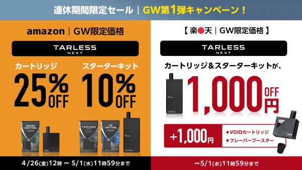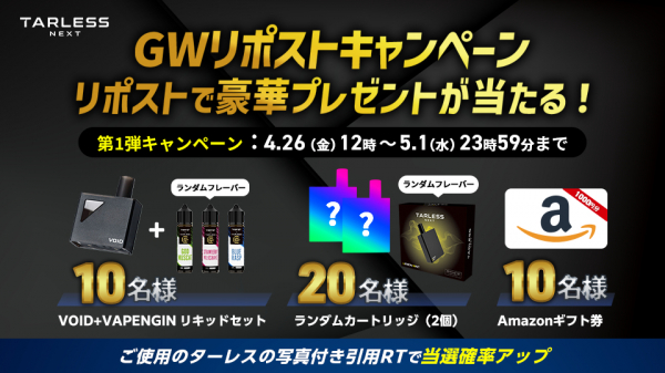 株式会社ドローム(本社:千葉県柏市)は、喫煙の概念を変える電子タバコ【TARLESS(ターレス)】ブランドが4月26日12時〜5月1日11時59分からGW期間中大規模キャンペーンを開催!