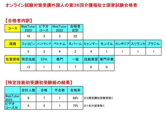 基本学習動画と復習ZOOM授業の組みわせで実施される「WebTutor2023コース」では、16名の外国人が合格しました。このコースでは、受講料について雇用施設側の支援を受けることができなかった特定技能外国人に対し、特別に受講料を免除しています。そのような特定技能介護職が24名在籍し、うち、8名が初めてのコース受講で国家試験にチャレンジしました。結果は、7名が合格を果たし、実に一発合格率が88%となりました。