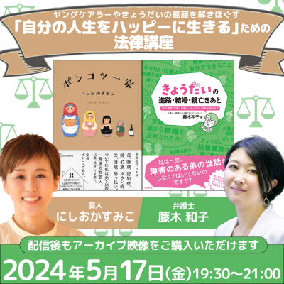 本イベントではにしおかさんが「自分の人生を生きる」ために押さえておきたい法律を藤木さんに学びつつ、きょうだい当事者としての本音を語り合います。