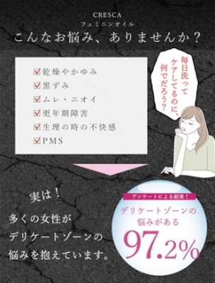 この『クレスカフェミニンオイル』が解決する課題はというと、年齢と共に悩みが増えるデリケートゾーンの悩み。