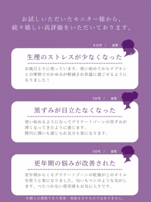 発売に先駆けたモニターの声も続々!ナプキンのこすれによるかゆみやデリケートゾーンの黒ずみ、更年期特有の悩みも軽減したといううれしいお声が届いています。