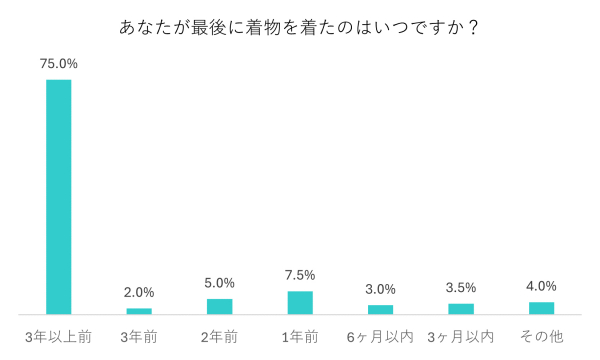 3年以上着物を着ていない人は75%であり、前回調査の63.5%に比べて11.5ポイントの増加となりました。現代人の日常生活において、着物を着る機会は減少していることがうかがえます。