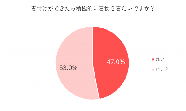 着付けができたら積極的に着物を着たい人は全体の47%となり、前回調査(49%)とほぼ変わらない結果となりました。
