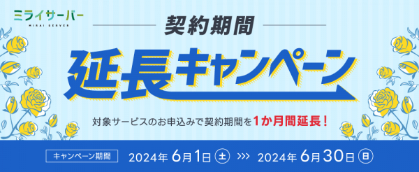 ミライサーバー(運営会社:アシストアップ株式会社、所在地:大阪府大阪市、代表取締役:青木 勝彦)は、2024年6月1日(土)〜2024年6月30日(日)の期間、契約期間延長キャンペーンを実施いたします。