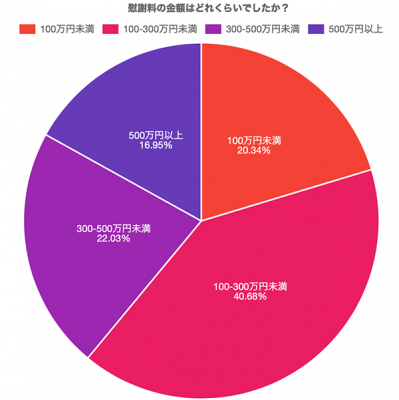 アンケート結果では、100万円〜300万円未満で慰謝料の取り決めがされた方が最も多く、40.68%でした。