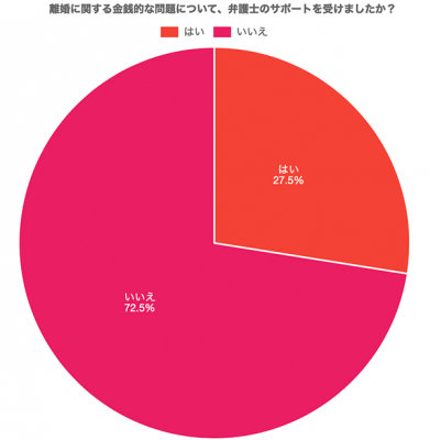 アンケート結果を見ると、72.5%の方が離婚に関する金銭的な問題(慰謝料・養育費・財産分与など)について、弁護士のサポートを受けずに終えています。