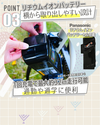 走行距離の目安 強モード:約25km・標準モード:約29km・エコモード:約32km