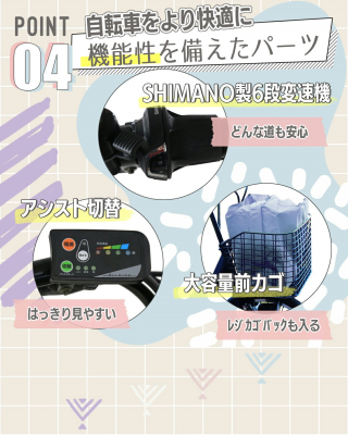 性能/機能 ・アシスト/電源を切って普通自転車としても走行可能