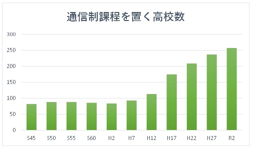 全日制・定時制課程を置く高等学校の校数は減少傾向にあります。一方で通信制課程を置く高等学校は、私立で211校(2023年5月時点、前年度比15校増)で、生徒数は20万7537人(同2万3891人増)と大幅に伸びています。公立の通信制高校についてもわずかですが増加しています。通信制高校のニーズの高まりが数字からも見えてきます。