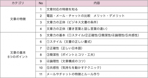 今回提供を開始する「メール・チャット研修動画プラン」では、電話やメール、チャットの特性に関する比較や書き言葉と話し言葉の違いなどを解説する「文章の特徴パート」、文章の基本や実務としてのルール作りを解説した「文章の基本5つのポイントパート」に分け、計11コンテンツを提供します。これらの研修動画を通じて、メールとチャットの特性を理解し、顧客との信頼関係を築くテクニックを習得することができます。