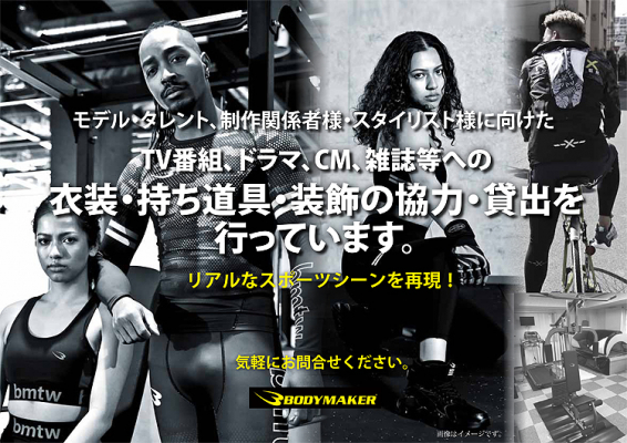 BODYMAKERが、「衣装・持ち道具・装飾の協力・貸し出し」を本格的にスタート!以前からも貸し出しは、問い合わせがあった場合のみ審査の上、行っていたが、反響もよく、件数も増えてきたので、この度、テレビ番組、ドラマ、CM、雑誌などの制作関係者様、スタイリスト様向けに「衣装・持ち道具・装飾の協力・貸し出し」サービスを本格的に立ち上げた。ウエア・トレーニング用品などスポーツシーンをリアルに再現できます。HPの窓口から申し込み手順、利用条件、貸出期間、注意事項などよくご覧の上、メールで気軽にお問い合わせください。