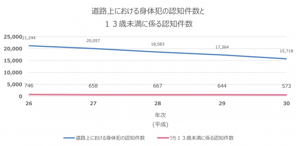 川崎市をはじめ、徹底した防犯対策を保護者および学校、地域で子どもたちに教える活動が 行われていますが、13歳未満を対象とした道路上における身体犯(※)の認知件数は、全年齢を対象とした場合、年々減少傾向にある一方で、残念ながらほぼ横ばいで推移している状況です。