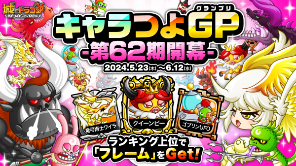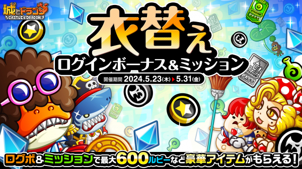 5月30日(木) より、全国のユーザーを相手にリアルタイムで戦うバトルイベント「リーグ」が開催。今回は“ひとりで”リーグに挑むとCPやドラゴンメダルなどが獲得できる「ひとりでリーグ激レアアイテム争奪バトル」を併催いたします。また、ルビーなど豪華アイテムが入手可能な「衣替えログインボーナス&ミッション」や、キャラ育成がはかどる「開発強化キャンペーン」、さらに“キャラつよP”を競う「キャラつよグランプリ」の第62期も開催中です。ぜひこの機会に、城ドラをプレイしましょう!