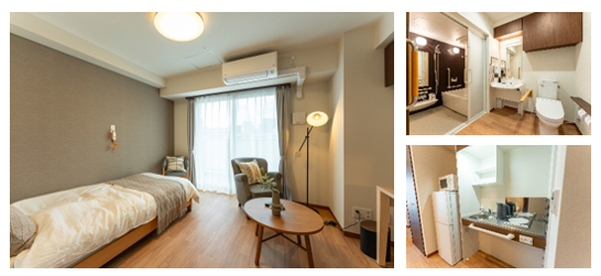 プライバシーに配慮した、全室個室の住空間です。トイレ、洗面台のほか、ミニキッチンや浴室、洗濯機置き場、プライベートWi-Fi(無料)を完備し、機能が充実した居室となっています。また、全居室に緊急通報装置と人感センサーを標準装備しているので、安心してお過ごしいただけます。