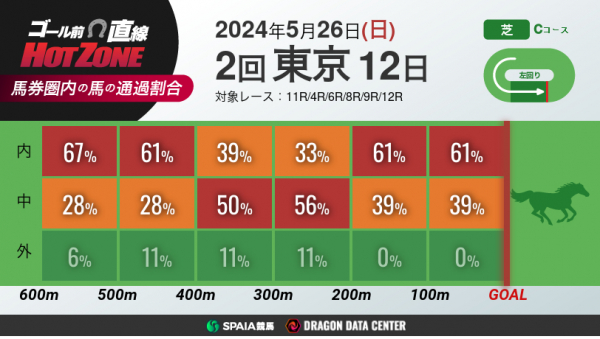蓄積したデータのコンテンツ利用の第一弾として、レース当日の上位入着馬が通過したゴール前直線の複数の位置で、100mごとに内・中・外の3段階のデータを取得し可視化した画像コンテンツの配信を開始いたします。