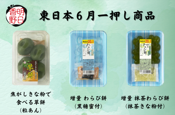 東日本では「明日香野わらび餅増量キャンペーン」として、6月1日から6月30日までの期間限定で当社比20%増量のわらび餅シリーズを販売中です。