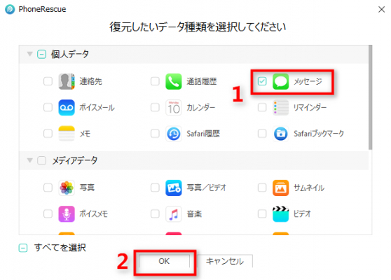 Step4:「メッセージ」を選択し、「OK」に移動します(PhoneRescueはチャックボックスに入れたデータを復元し、他に復元したいデータがあれば一括で選択するのもOK)。