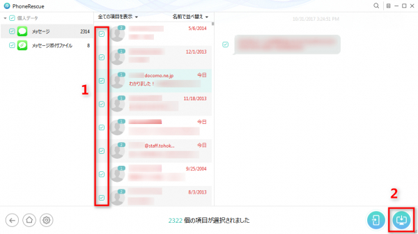 Step5:復元したいショートメールを選択し(複数を選択する可能)、iPhone又はパソコンに復元します。