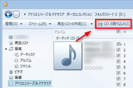 Step1:パソコンでAnyTransをダウンロードし、起動します。そして、Windows Media Playerを開きます。「CDの取り込み」ボタンをクリックして、音楽をパソコンに取り込みます。