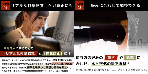 ネットショップSantasan(運営:日本タイガー電器株式会社)にて、同社ボクシングブランドEasyChangeより、"水のサンドバッグ"ウォーターサンドバッグが6/26〜販売。一般的なものとは違い、中身が水の画期的な本製品は扱い易さにおいて大きなメリットがあります。各ネットショップにても送料無料で販売しています。本体価格/7,000円(税込)