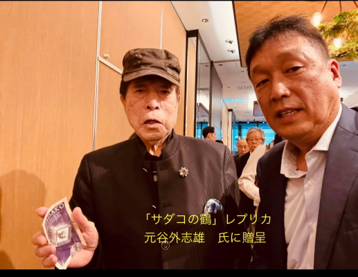 唯一被爆国の日本人の1人として核兵器廃絶を目指し、広島で被爆して12歳で亡くなり、平和記念公園の「原爆の子の像」のモデルになった佐々木禎子さんが残した折り鶴のレプリカ「サダコの折り鶴」を元谷 氏にも寄贈した。